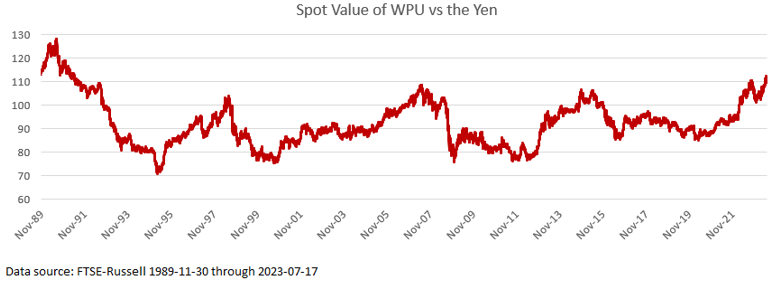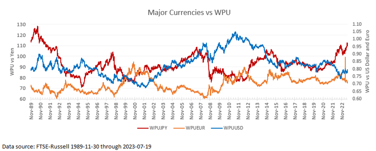 The return on WPU depends on the currency in which the return is measured. The chart below shows the returns from a US Dollar, Euro and the return for a Yen based investor in WPU.
