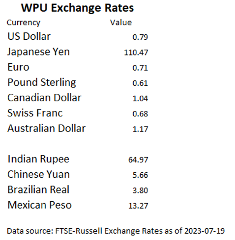 The following table gives the rates of WPU against the major currencies as of July 17, 2023: