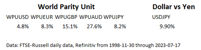 Smaller currencies are more volatile. So smaller currencies will rise and fall more against WPU. This highlights the point that an investor’s local currency is volatile, when measured in global terms.