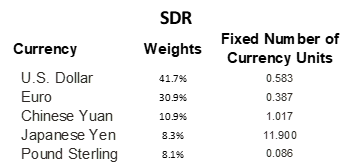 [4] Note that, in contrast, the SDR weights are fixed. Hence, the SDR cannot be held passively: a portfolio to track the SDR must be continually traded to bring the weights back in line with the fixed SDR weights as exchange rates move.
