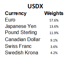 [12] The USDX® weights were derived from an out-of-date Federal Reserve trade weighted currency index. Hence, it has a very high 57.6% weight, in Euros. This index was designed to measure US trade competitiveness.