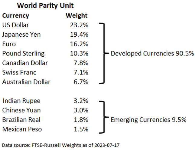 Short run currency devaluation risk is addressed by diversified exposure to the developed currencies to minimize the volatility of WPU in US Dollar terms, subject to diversification and liquidity considerations. The US Dollar is included in WPU at the US share of global GDP.